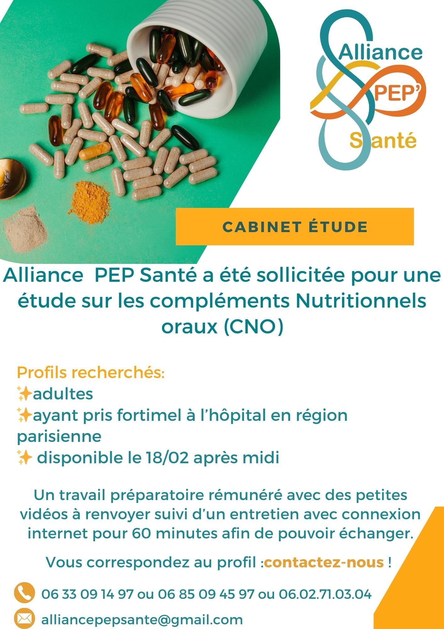 Contactez-nousAlliance PEP Santé a été sollicitée dans le cadre d'une étude portant sur la prise d'un complément nutritionnel oral (fortimel)