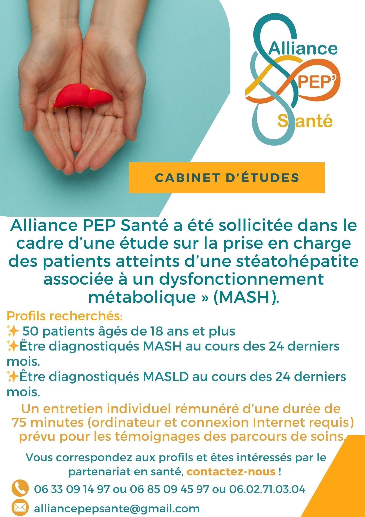 Contactez nousAlliance PEP Santé est sollicitée dans le cadre d'une étude sur la prise en charge des patients atteints de stéatose hépatique associé à un dysfonctionnement métabolique.