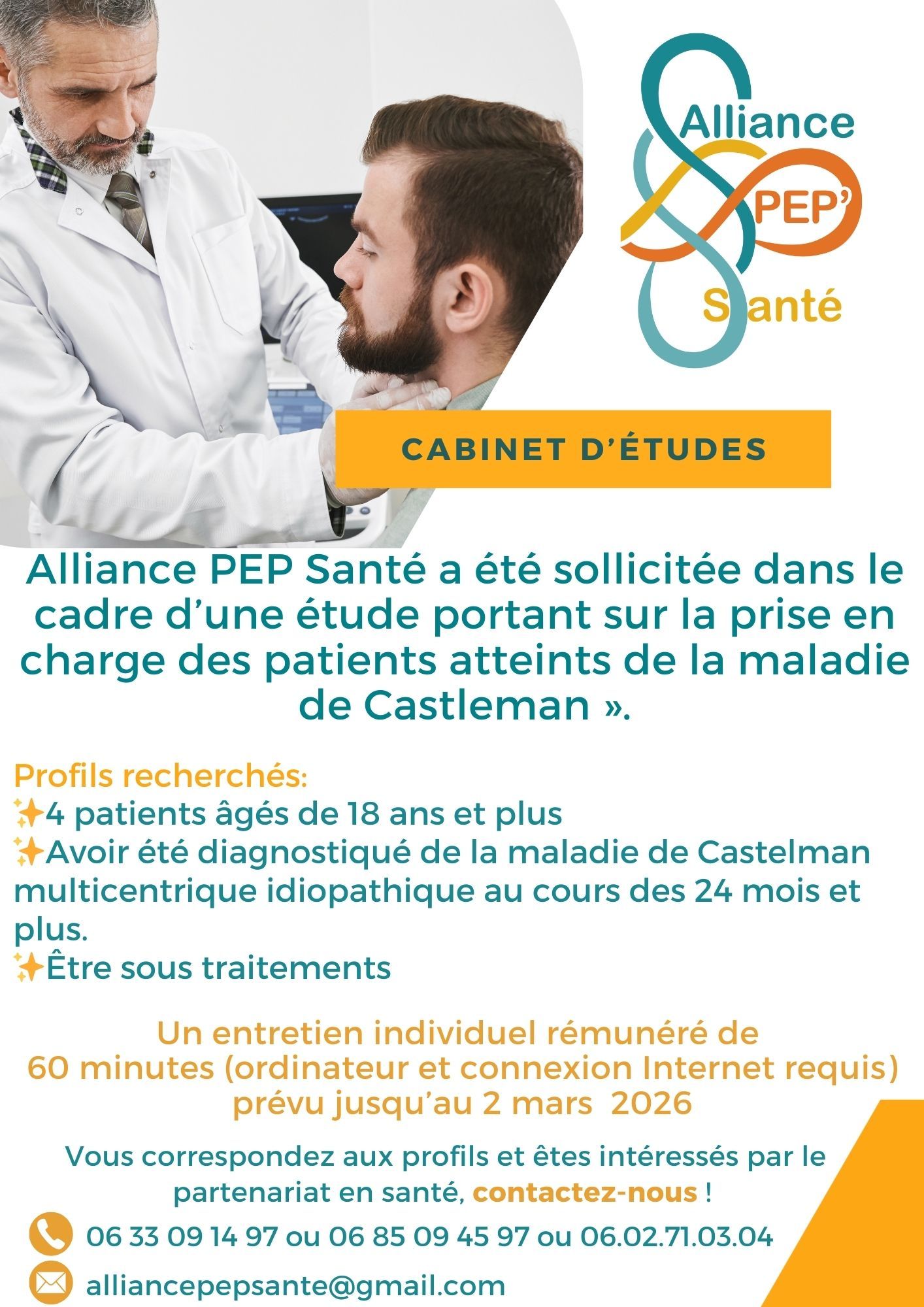 Contactez-nousAlliance PEP Santé a été sollicitée dans le cadre d'une étude portant sur la prise en charge des patients atteints de la maladie de Castleman.