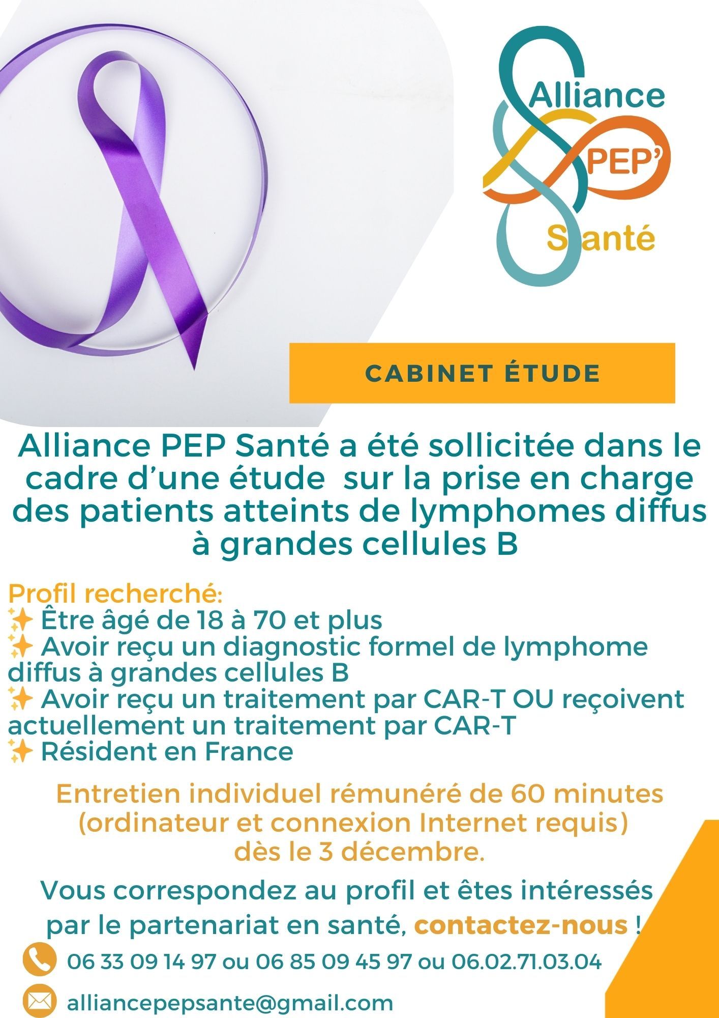Contactez-nousAlliance PEP Santé a été sollicitée dans le cadre d'une étude portant sur la prise en charge des patients atteints de lymphomes diffus à grandes cellules B.