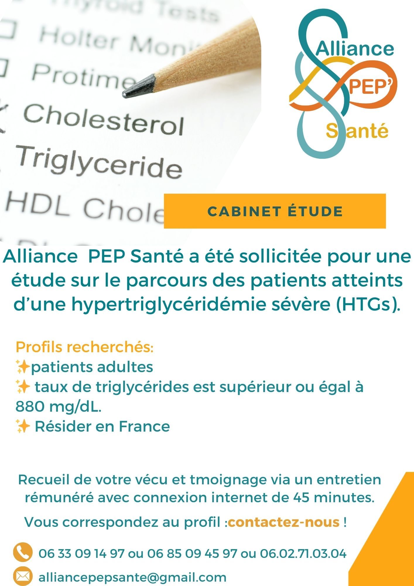 Contactez-nousAlliance PEP Santé a été sollicitée dans le cadre d'une étude portant ur le parcours des patients atteints d’une hypertriglycéridémie sévère (HTGs).